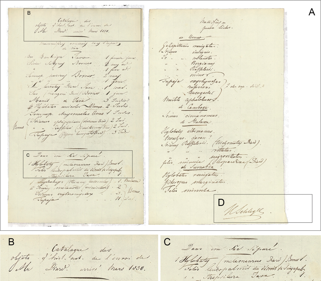 A two-page document listing records of specimens sent by Diard to Leiden in March 1830 (A) with the upper part of the first page (B), shows a title of the document “Catalogue des objets d’hist. nat. de l’envoi de Mr Diard arrivé mars 1830”, while the bottom part of the page (C), shows “Felis leucopalmis du détroit de Singapour” (translated: Felis leucopalmis from the Strait of Singapore) was among the specimens sent by Diard; at the bottom part of the second page, the document was signed by H. Schlegel (D). Reproduced from Natuurkundige Commissie Archives Online (Gasso et al. 2020)